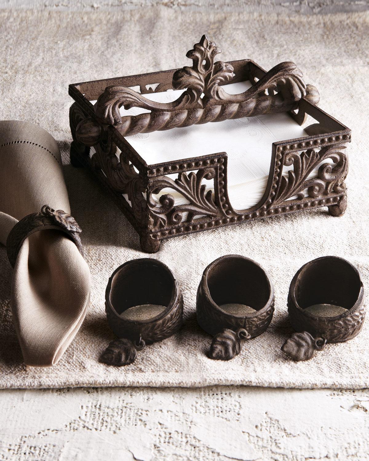 Consists of four rings for cloth napkins and the stand for paper napkins.